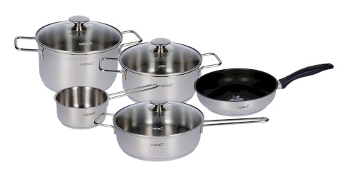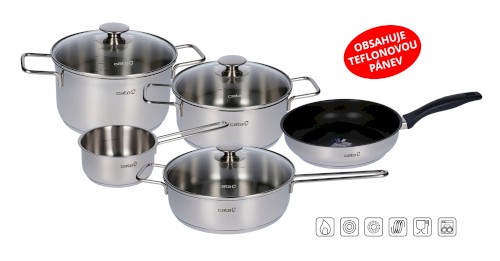 Atraktivní design z leštěného nerezu, promyšlené detaily (odměrné značky, skleněné poklice s ventily pro odvod páry), kvalitní zpracování (sendvičová dna, pevné spoje), špičkové materiály (jediná nerez sada na trhu s nerez pánví s odolným teflonovým povrchem), výhodná cena. Nádobí lze mýt v myčce.