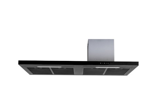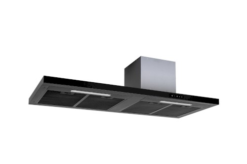 Komínová digestoř ke zdi s impozantním designem, šíře 120 cm, černá, skleněná odkládací police, max. výkon 691 m³/h (5 Pa), hlučnost Lw 53 – 73 dB(A), 5 rychlostí + TURBO, odsávací jednotky mají individuálně vyvažovanou turbínu, motory jsou opatřené vratnými tepelnými pojistkami (při přetížení motoru vypne, po jeho vychladnutí opět sepne), kovové sendvičové tukové filtry, které lze mýt v myčce, výstupní průměr 150 mm, možnost práce v odtahovém i recirkulačním režimu, VIP výbava: úsporné LED osvětlení 2 × LED PÁSEK 2,8 W, elektronické dotykové ovládání s LED displejem a s doběhovým časovačem, zdarma dálkový ovladač i s bateriemi, zdarma redukce na 120 mm a zpětná klapka, Benefity: používání dálkového ovládání usnadňuje údržbu digestoře (méně otisků na digestoři = snazší čištění), ovladač je opatřený magnetem, lze jej přichytit třeba na dveře lednice (může být snadno po ruce, nikam nezapadne)