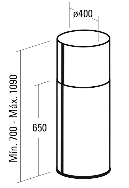Komínová ostrůvková, 40 cm, nerez, ovládání VL3 s modře prosvětlenými tlačítky, 1 motor BT3 280 W, 3 rychlosti, 800 m3/h (5 Pa), max. hlučnost Lw 67 dB(A), max. tlak 470 Pa, 15 min. časovač, LED světla, válcový tvar