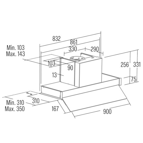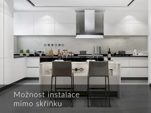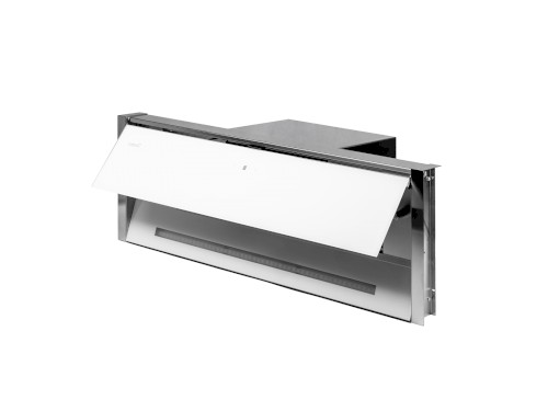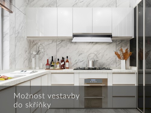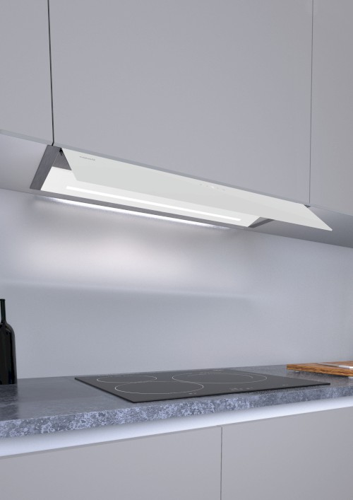 Neviditelná vestavná digestoř, 900 mm, nerez / bílé sklo, elektronické dotykové ovládání, 1 motor BT4DC, 5 rychlosti + TURBO, max. výkon 765 m³/h (5 Pa), hlučnost Lw 46 – 67 dB(A), max. tlak 357 Pa, kovové sendvičové tukové filtry, které lze mýt v myčce, výstupní průměr 150 mm, možnost práce v odtahovém i recirkulačním režimu, snadná montáž, Výbava: úsporné LED osvětlení 1 × 7 W LED pásek s nastavitelnou intenzitou i volitelnými 2 tóny světla , výklopné skleněné stínítko pro zvětšení plochy odsávání a pro ochranu dvířek skříňky.