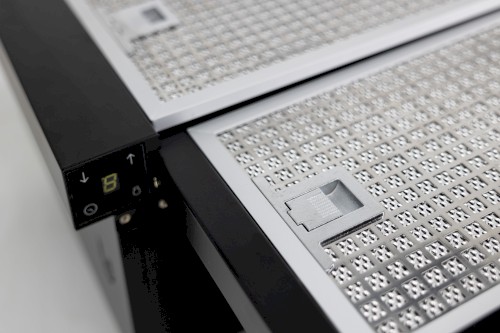 Vestavná výsuvná digestoř s bezkartáčovým motorem: šíře 600 mm, černá, 1 motor T1DC 90 W, 5 rychlostí + TURBO, 575 m3/h (5 Pa), max. tlak 300 Pa, max. hlučnost Lw 63 dB.