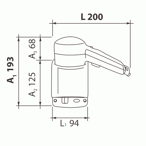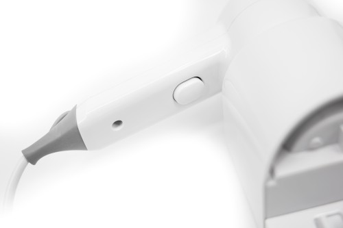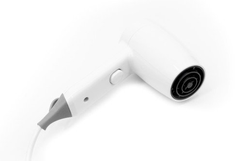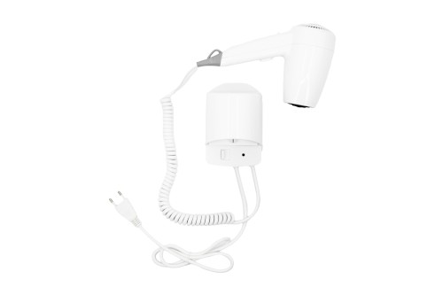 Hotelový fén s montáží na zeď, 2 rychlosti, 220 V - 240 V / 50 - 60 Hz, příkon 450 W (1. rychlost) / 1.200 W (2. rychlost), přepínač rychlostí a spouštěcí tlačítko na rukojeti, hlavní vypínač na stojánku, materiál ABS, bezpečnost CLASS II, dvojitá izolace, rozměry 180 mm výška × 150 mm šířka × 100 mm hloubka, hmotnost 0,65 kg
