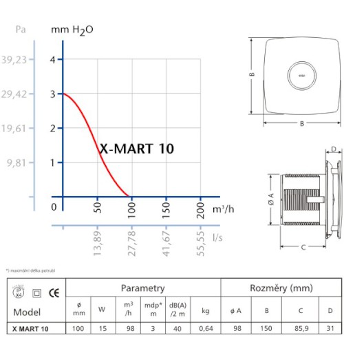 Axiální ventilátor na zeď, do stropu či do okna X-MART, supertichý, super design, snadné čištění, pr. 100 mm, 98 m³/h, 40 dB(A), 3 mmH2O (29 Pa), IPX4, nerez čelní deska!