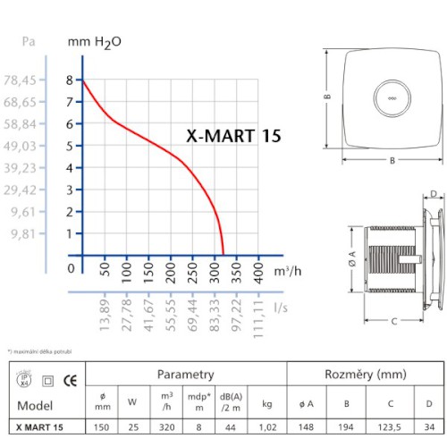 Axiální ventilátor na zeď, do stropu či do okna X-MART, supertichý, super design, snadné čištění, pr. 150 mm, 320 m³/h, 44 dB(A), 8 mmH2O (78 Pa), IPX4, nerez čelní deska!