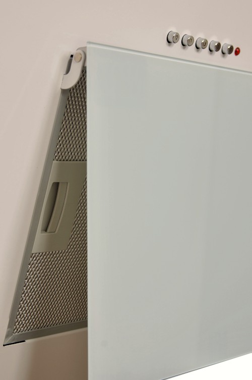 Korpus a velký šikmý panel je z bíle lakovaného plechu / Středový (menší) panel je z mléčně bílého skla |