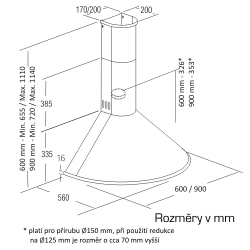 Komínová ke zdi, 900 mm, černá, 1 motor 240 W, 3 rychlosti, 645 m³/h (5 Pa), max. hlučnost Lw 71,8 dB(A), max. tlak 430 Pa