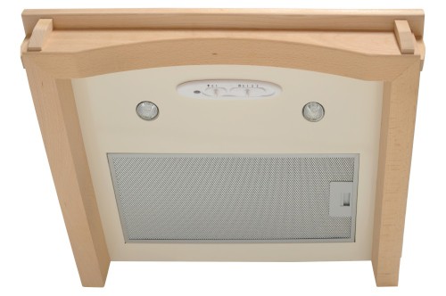 Rustikální komínová digestoř, šíře 60 cm, bílá / nemořená buková lišta, max. výkon 405 m³/h (5 Pa), hlučnost Lw 51 – 61 dB(A), 3 rychlosti, odsávací jednotky mají individuálně vyvažovanou turbínu, motory jsou opatřené vratnými tepelnými pojistkami (při přetížení motoru vypne, po jeho vychladnutí opět sepne), mechanické posuvné ovládání, kovové sendvičové tukové filtry, které lze mýt v myčce, možnost práce v odtahovém i recirkulačním režimu, výstupní průměr 150 mm, Výbava: úsporné LED osvětlení 2 × 2 W, zdarma redukce na 120 mm a zpětná klapka, Benefity: nemořená dřevěná lišta umožňuje individuální barevné doladění třeba podle materiálu kuchyně