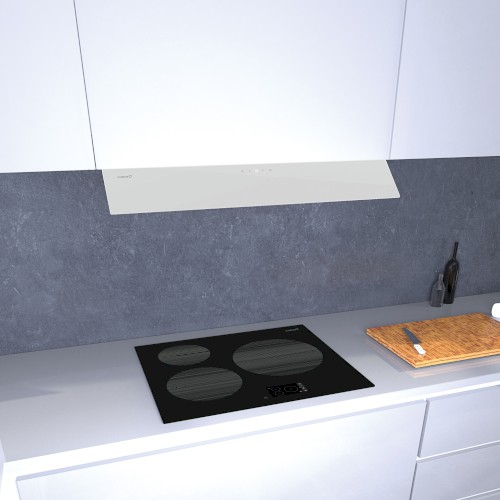Neviditelná vestavná digestoř, 900 mm, nerez / bílé sklo, elektronické dotykové ovládání, 1 motor BT4DC, 5 rychlosti + TURBO, max. výkon 765 m³/h (5 Pa), hlučnost Lw 46 – 67 dB(A), max. tlak 357 Pa, kovové sendvičové tukové filtry, které lze mýt v myčce, výstupní průměr 150 mm, možnost práce v odtahovém i recirkulačním režimu, snadná montáž, Výbava: úsporné LED osvětlení 1 × 7 W LED pásek s nastavitelnou intenzitou i volitelnými 2 tóny světla , výklopné skleněné stínítko pro zvětšení plochy odsávání a pro ochranu dvířek skříňky.