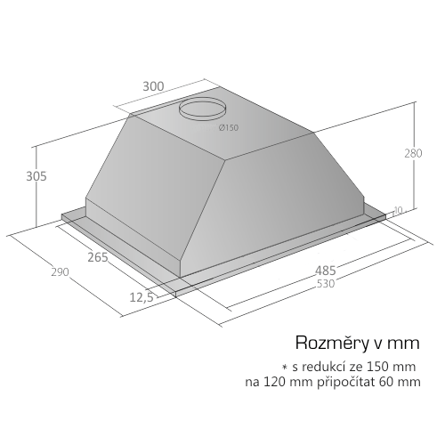 Pro výrobu skříňky je směrodatný rozměrový nákres a údaje v něm uvedené. Fotografie digestoří jsou ilustrační.