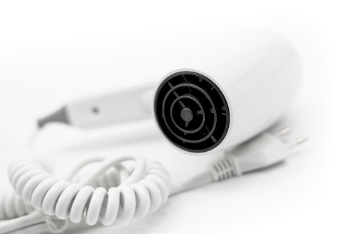 Hotelový fén s montáží na zeď, 2 rychlosti, 220 V - 240 V / 50 - 60 Hz, příkon 450 W (1. rychlost) / 1.200 W (2. rychlost), přepínač rychlostí a spouštěcí tlačítko na rukojeti, hlavní vypínač na stojánku, materiál ABS, bezpečnost CLASS II, dvojitá izolace, rozměry 180 mm výška × 150 mm šířka × 100 mm hloubka, hmotnost 0,65 kg