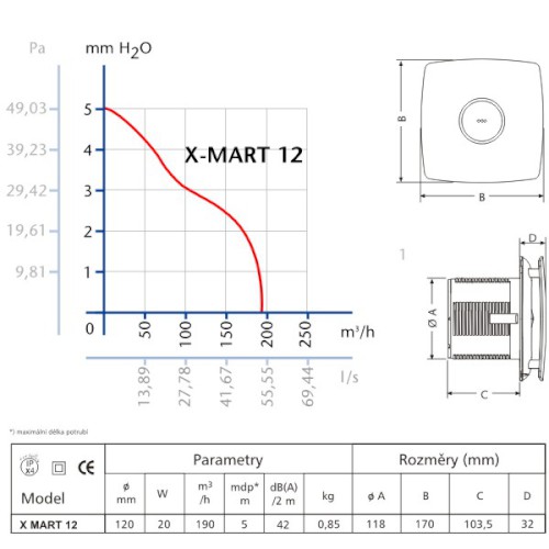 Axiální ventilátor na zeď, do stropu či do okna X-MART, supertichý, super design, snadné čištění, pr. 120 mm, 190 m³/h, 42 dB(A), 5 mmH2O (49 Pa), IPX4, snímač vlhkosti s funkcí doběhu, nerez čelní deska!